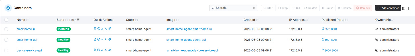 For local deployment, we're using Docker Compose. The boot order matters: the device-service-api comes up first since both the agent and the UI depend on it. Then the agent-api is launched, followed by smarthome-ui. You can check the full Docker Compose file here.