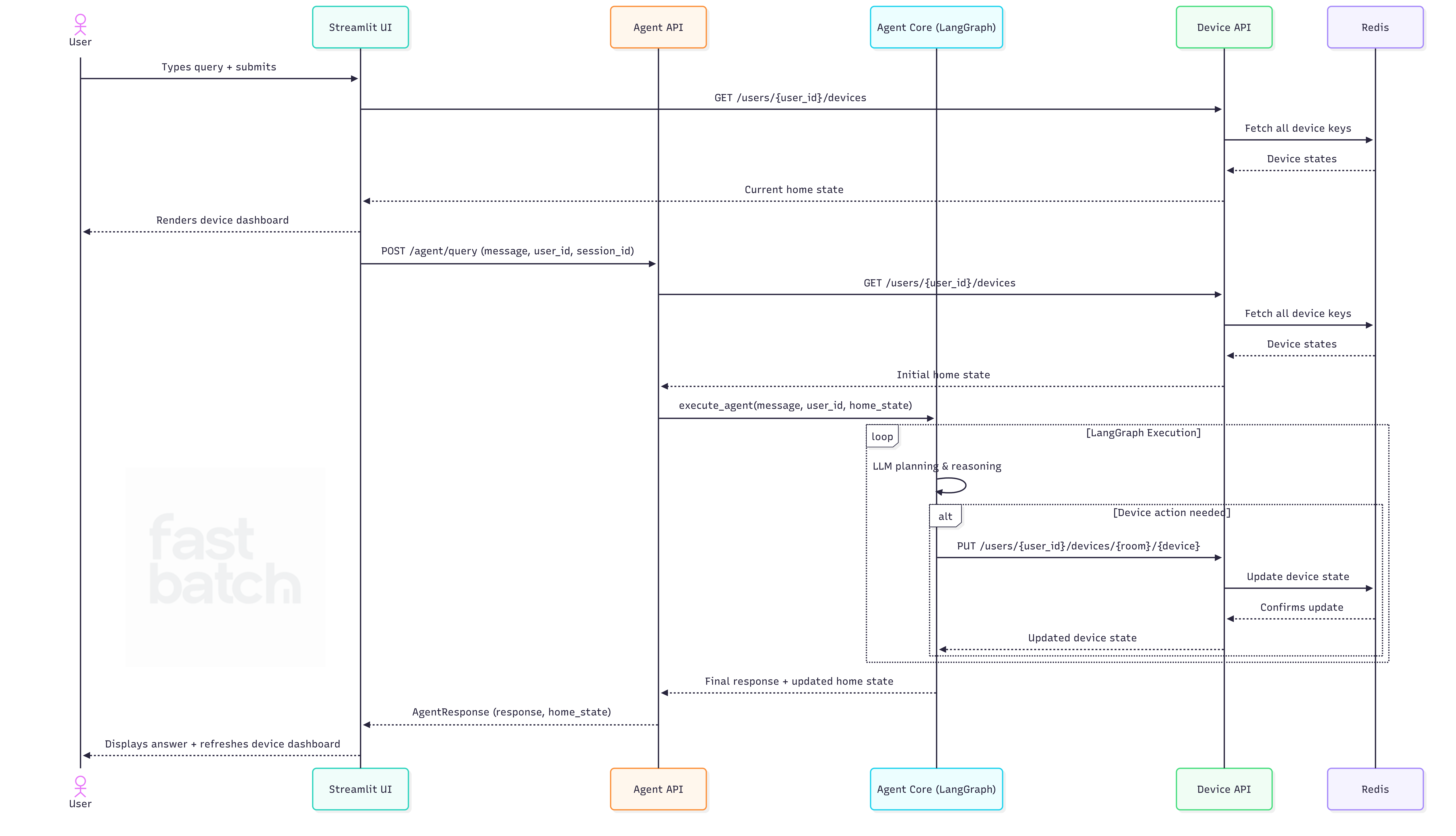 Once the user logs in, the current home state is fetched from the device state API and displayed. When a query is submitted via the chat interface, a request is sent to the agent API. Once the response comes back, the agent’s answer is displayed and the device status is updated accordingly (see the video for a demo).